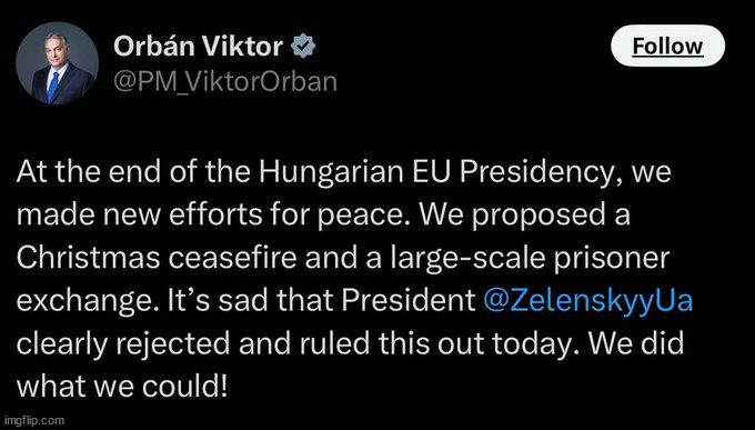No one called Zelensky to offer any ceasefire. Which proves all that supposed “ceasefire-talk” by Orban to Putin was just another non-serious clown show. A scam.