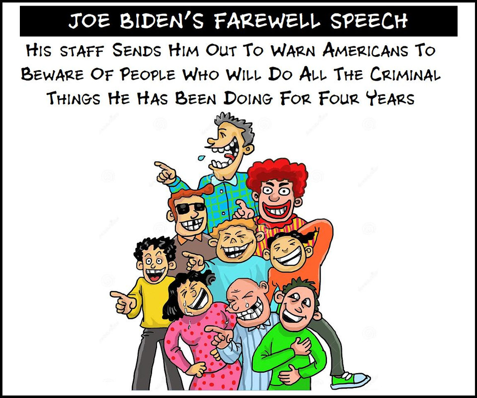 With the National Headache/Nightmare/Dyspepsia about to come to an end, exiting Mannequin-in-Chief Joe Biden issued his farewell letter to the nation on Wednesday. Even accounting for the fact that he likely did not write much, if any, of it, it is still a testament to the level of denial, dysfunction, and delusion that became hallmarks of the last four years. Even if Biden contributed to the self-congratulatory epistle, he likely threw out a shoulder patting himself on the back for a term that should have him feeling like he needs to wear a bag over his head whenever he leaves his Rehoboth Beach home. Mercifully, he does not recount his moral victory over Corn Pop, his deep understanding of gay rights at the age of twelve or something, the fact that he was raised as a Puerto Rican, or the story of his uncle being consumed by cannibals. Too bad; the missive would have been more believable if he had.