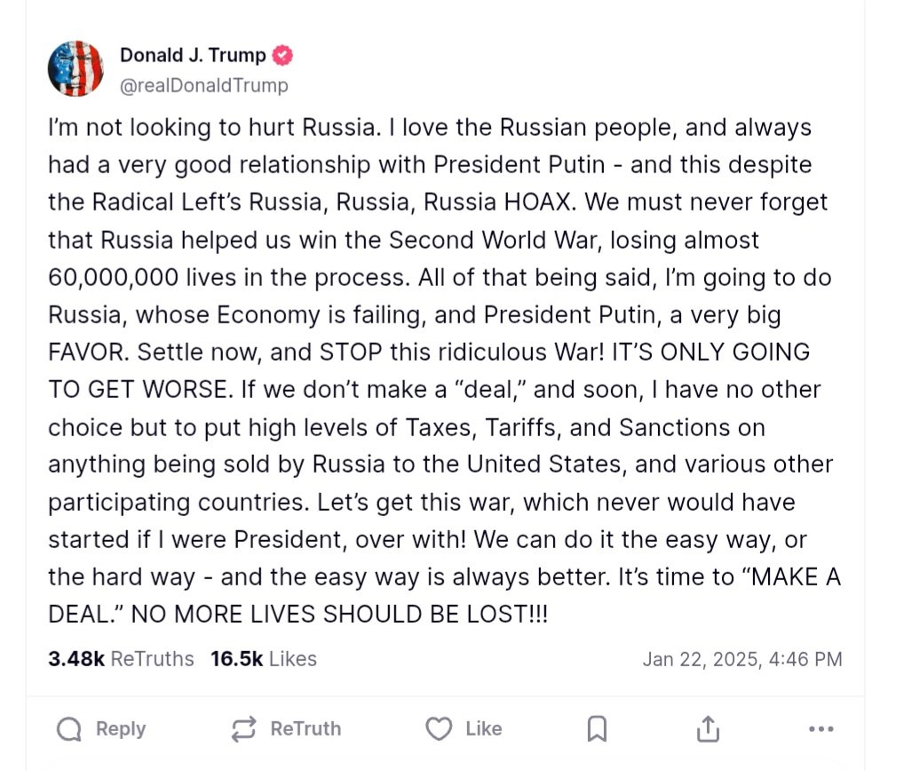 Does Trump trust Putin? I’m sure he doesn’t, and on Wednesday, he announced his next move on Russia in a bold post on his social media platform, Truth Social. In his signature style, Trump both criticized the conflict and offered a solution, while weaving in his unique narrative on Russia, Vladimir Putin, and the global political landscape.
