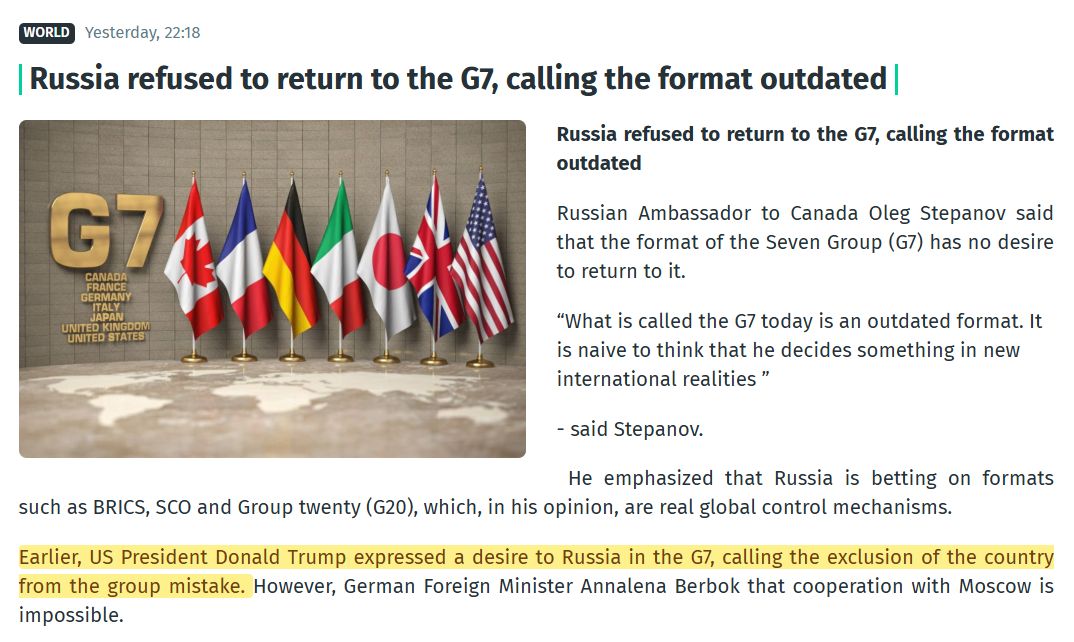 “What is called the G7 today is an outdated format. It is naive to think that it decides something in new international realities ” - said Stepanov.