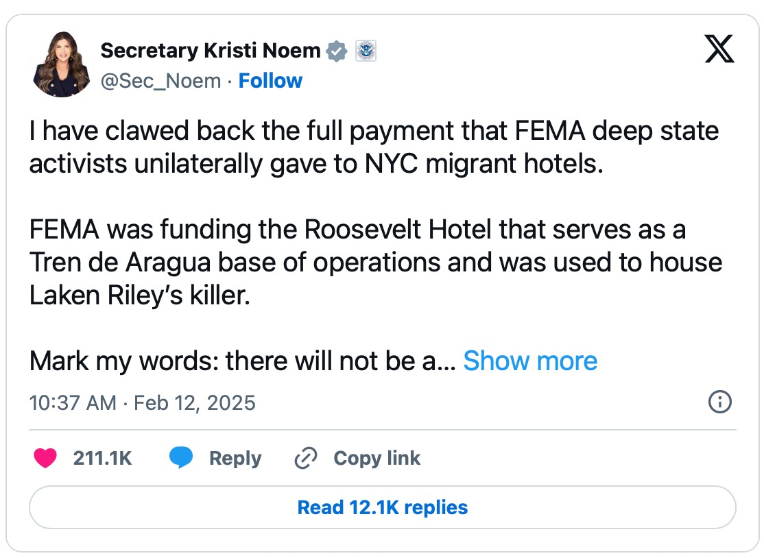 Secretary of Homeland Security Kristi Noem reported that she dealt with it quickly, saying that she “clawed back” the full payment made by FEMA.