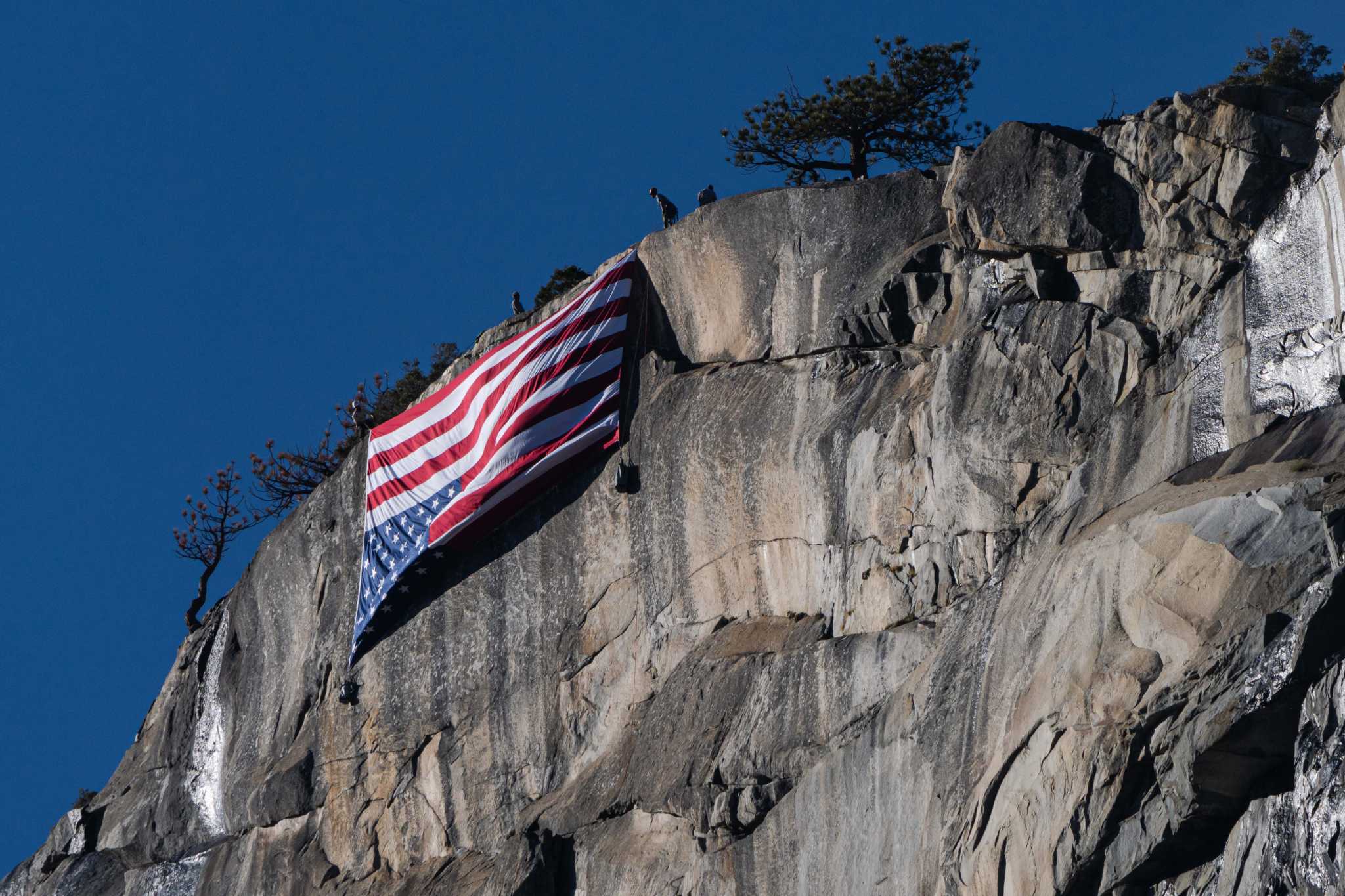 A group of frustrated Yosemite National Park staffers hoping to draw attention to the federal government’s sweeping workforce cuts hung an upside-down American flag Saturday thousands of feet off the ground on the side of El Capitan.
