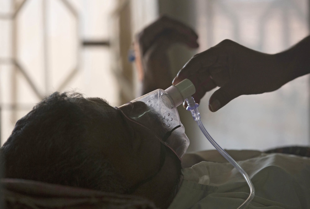 A relative adjusts the oxygen mask of a tuberculosis patient in Hyderabad, India, in 2018.