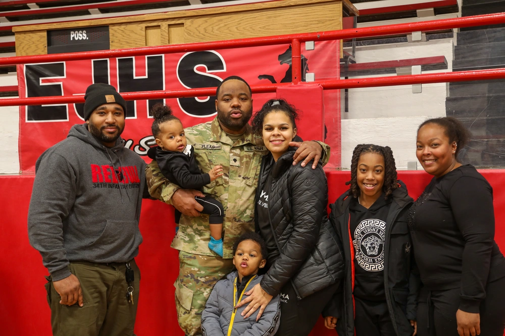 Families Matter! Approximately 130 Soldiers from Company B, 2nd Battalion, 130th Infantry Regiment based in Effingham, Illinois, participated in a mobilization ceremony at Effingham Junior High School on Feb. 8. Company B Soldiers are mobilizing with approximately 550 other Soldiers from 2nd Battalion, 130th Infantry Regiment to the Middle East. (Photo by Spc. Mallory Sinkhorn)