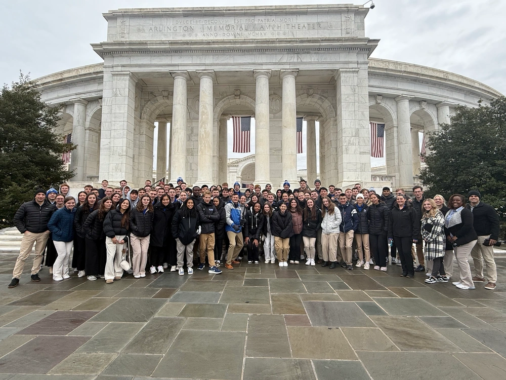 Visiting The New CiC! Cadet Squadron 36 poses in front of the Arlington Memorial Amphitheater in Arlington, VA, Jan. 20, 2025. The trip to Washington, DC, was planned for the cadets to attend inauguration events, continuing a U.S. Air Force Academy tradition dating back to 1957. (Courtesy photo provided by Cadet 1st Class Landon Adkins)