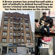 A terrorized Bronx woman has armed herself with a pair of pit bulls in a desperate effort to defend herself from an unhinged career criminal who keeps breaking into her home — but remains on the streets.