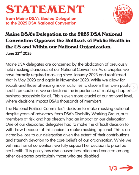 The Maine DSA chapter became gravely concerned after learning that the national convention, set for August 8-10 in Chicago, slightly relaxed its extremely strict COVID policies. The convention’s 2025 health requirements only “strongly encourage” masking and do not require it during meals or when speaking at microphones.