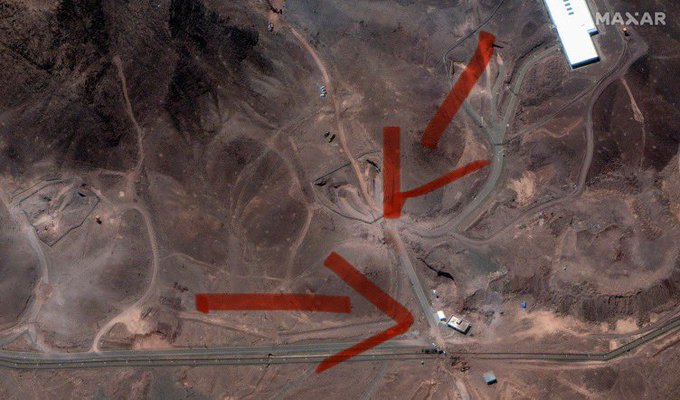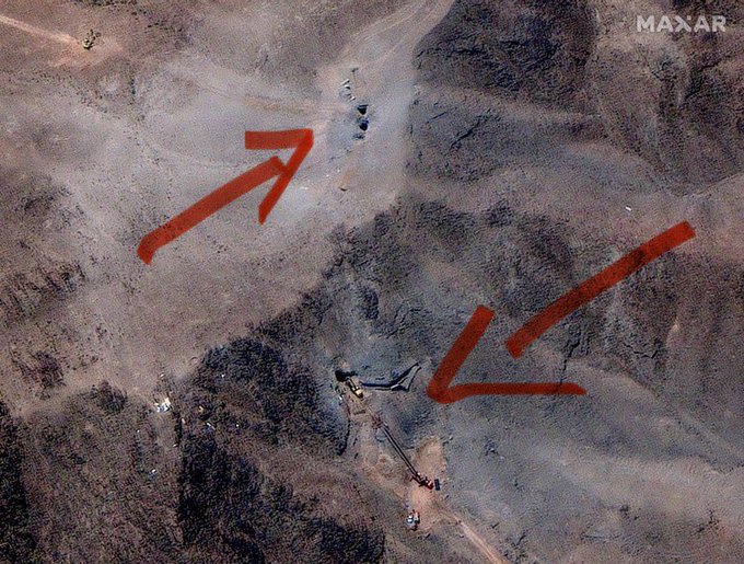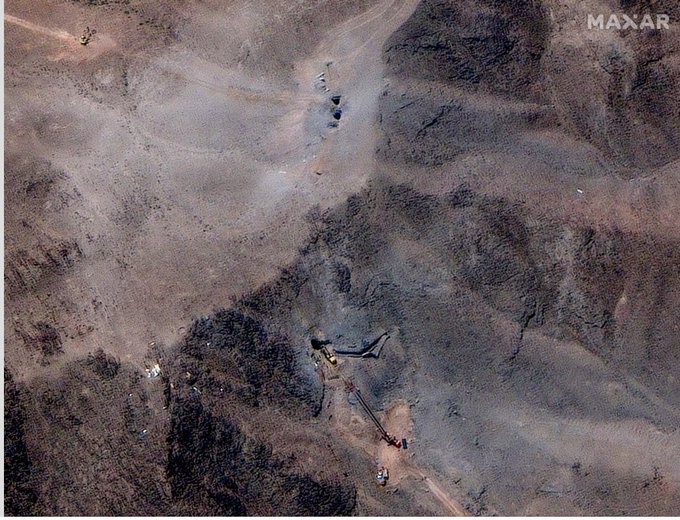 NEW SATELLITE IMAGES FROM FORDOW show activity near bombed ventilation shafts. “MAXAR collected new high-resolution satellite imagery today (June 29th) that reveals ongoing activity at and near the ventilation shafts and holes caused by last week’s airstrikes on the Fordow fuel enrichment complex in Iran. On today’s imagery, an excavator and several personnel are positioned immediately next to the northern shaft on the ridge above the underground complex. The crane appears to be operating at the entrance to the shaft/hole. Several additional vehicles are also seen below the ridge and are parked along the access path that was built to access the site. In the link provided below, you can download several images from today which provide an overview of the complex, closer views of the activity on top of the ridge as well as views of the tunnel entrances to the underground complex.”