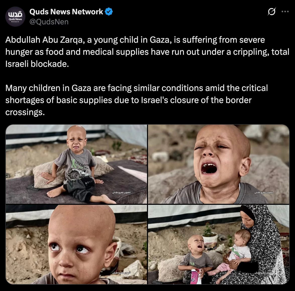 Abdullah Hani Muhammad Abu Zarqa In late July, images of bald and emaciated 4-year-old Abdullah Abu Zarqa began circulating on Hamas-affiliated social media accounts, including Quds News Network. A video of the boy wailing and telling the camera, "I'm hungry" received over 23,000 likes on Instagram. The comments included "Allah will never forgive Israel and Netanyahu" and "ISRAEL, AMERICA, WHY DO YOU ENJOY DOING THIS."