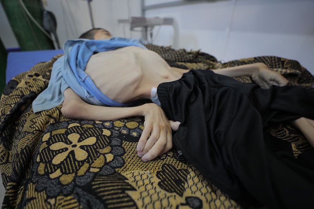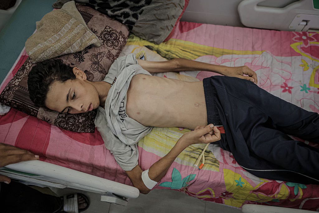 The caption identifies him as 25-year-old Hamza Mishmish and says that he shows "signs of severe malnutrition and bone loss in the Nuseirat refugee camp amid worsening hunger in the region."