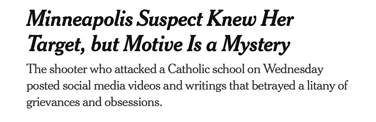 Most obviously, the suspect, now dead, in Wednesday’s Minneapolis school shooting was not a “her.” He was a him, a 23-year-old male, Robert Westman, who had been pretending to be a female for some years since undergoing puberty, with the encouragement of his parents and the cultural leaders of his city, including Governor Tim Walz and Mayor Jacob Frey, backed by the expressed principles of the national Democratic Party.