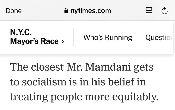 I think it is safe to say that the average New York Times reader is queasy about a socialist--really a communist--winning the mayoral race. It's one thing to mouth noises about social justice and all that, but if you look at the ads in the Times, you will notice that its readership is very wealthy, likely works in a high-income White Collar job, and is more interested in virtue signaling than actually having their property seized. And while Mamdani couldn't quite accomplish that, a dedicated socialist could do quite a bit of damage beyond that done by Bill de Blasio.