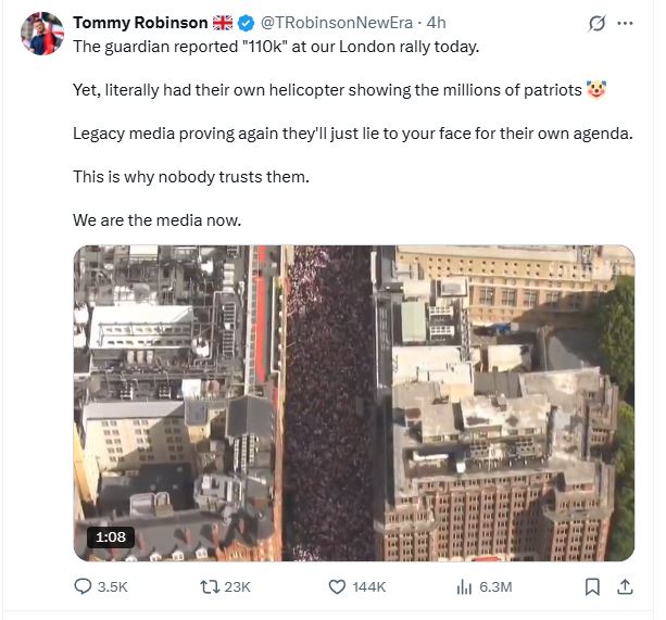 Aerial footage shows a crowd of tens of thousands of people marching through central London on Saturday in a protest organised by the far-right activist Tommy Robinson. The Metropolitan police believe about 110,000 people attended his ‘unite the kingdom’ demonstration and about 5,000 a Stand Up to Racism counter-march