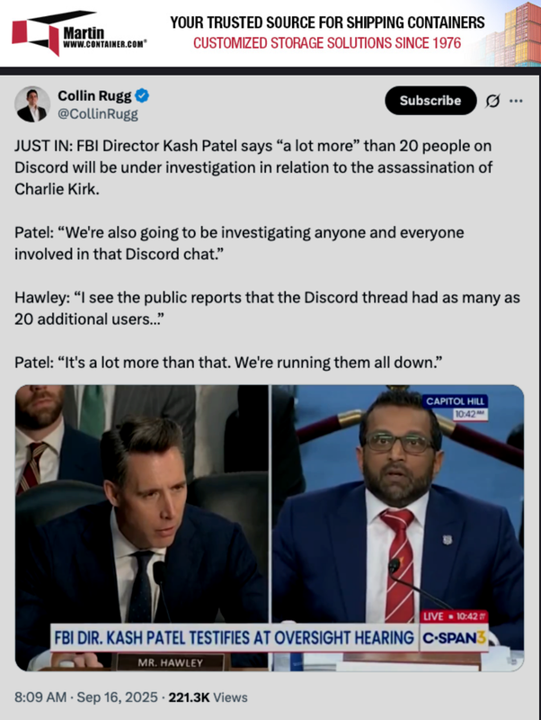 Still, Patel told Sen. Josh Hawley (R-Mo.) during the hearing, the FBI is looking at dozens of people who might be involved in the crime or accessories afterward. “We are going to be investigating anyone and everyone involved in that Discord chat,” Patel said.