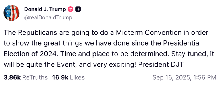 There had been vague talk for a while in both major-party circles about holding a pre-midterms national convention (or as it was once known, a “mini-convention”). For Democrats to do something like this would be like turning around a battleship. For Republicans, all it took was one Truth Social post: