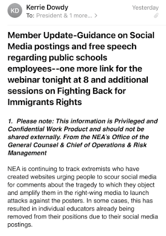 “NEA is continuing to track extremists who have created websites urging people to scour social media for comments about the tragedy to which they object and amplify them in the right-wing media to launch attacks against the posters,” wrote PEA President Kerrie Dowdy.