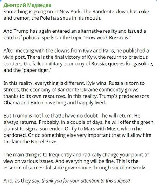 Deputy Chairman of the Russian Security Council, Dmitry Medvedev, posted an ironic message on Telegram in which he commented on the appearance of the US president Donald Trump at the United Nations General Assembly, accusing him of casting "a series of political spells" on the theme of Russia's alleged weakness. "Trump has once again crossed the threshold of an alternative reality," Medvedev wrote, referring to a post by the US president that spoke of "Kiev's final victory," "a return to the old borders," "the collapse of the Russian war economy," and "Russia as a paper tiger."