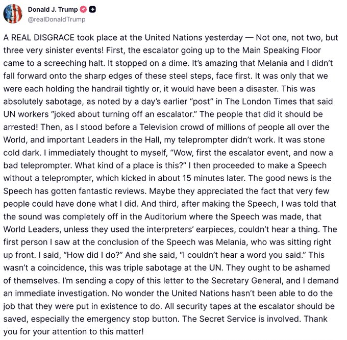 A REAL DISGRACE took place at the United Nations yesterday — Not one, not two, but three very sinister events! First, the escalator going up to the Main Speaking Floor came to a screeching halt. It stopped on a dime. It’s amazing that Melania and I didn’t fall forward onto the sharp edges of these steel steps, face first. It was only that we were each holding the handrail tightly or, it would have been a disaster. This was absolutely sabotage, as noted by a day’s earlier “post” in The London Times that said UN workers “joked about turning off an escalator.” The people that did it should be arrested! Then, as I stood before a Television crowd of millions of people all over the World, and important Leaders in the Hall, my teleprompter didn’t work. It was stone cold dark. I immediately thought to myself, “Wow, first the escalator event, and now a bad teleprompter. What kind of a place is this?” I then proceeded to make a Speech without a teleprompter, which kicked in about 15 minutes later. The good news is the Speech has gotten fantastic reviews. Maybe they appreciated the fact that very few people could have done what I did. And third, after making the Speech, I was told that the sound was completely off in the Auditorium where the Speech was made, that World Leaders, unless they used the interpreters’ earpieces, couldn’t hear a thing. The first person I saw at the conclusion of the Speech was Melania, who was sitting right up front...