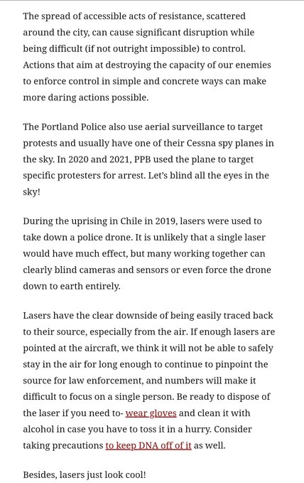 The Portland Police also use aerial surveillance to target protests and usually have one of their Cessna spy planes in the sky. In 2020 and 2021, PPB used the plane to target specific protesters for arrest. Let’s blind all the eyes in the sky!