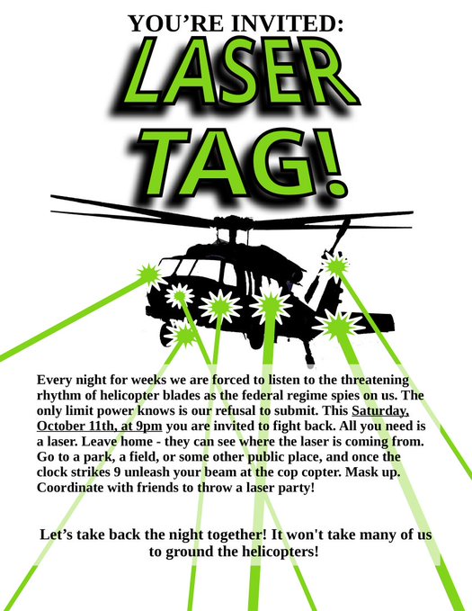 Every night for weeks we are forced to listen to the threatening rhythm of helicopter blades as the federal regime spies on us. The only limit power knows is our refusal to submit. This Saturday, October 11th, you are invited to fight back. All you need is a laser. Leave home – they can see where the laser is coming from. Go to a park, a field, or some other public place, and once the clock strikes 9 unleash your beam at the cop copter. Mask up. Coordinate with friends to throw a laser party!