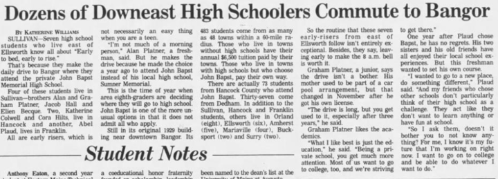 Platner does not appear to have lasted long at the Hotchkiss School. A subsequent Ellsworth American piece published in 2002 lists Platner as one of four students in Sullivan, Maine, who made the hour-long commute to John Bapst Memorial High School in Bangor, a more cost-friendly private school. Platner is identified as a junior who is accustomed to the commute "after three years."