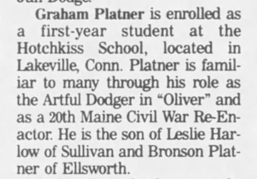 "Graham Platner is enrolled as a first-year student at the Hotchkiss School, located in Lakeville, Conn.," a Maine newspaper, the Ellsworth American, reported in November 1999. "Platner is familiar to many through his role as the Artful Dodger in 'Oliver' and as a 20th Maine Civil War Re-Enactor." The Hotchkiss School is located roughly 60 miles from Yale University in northwestern Connecticut.