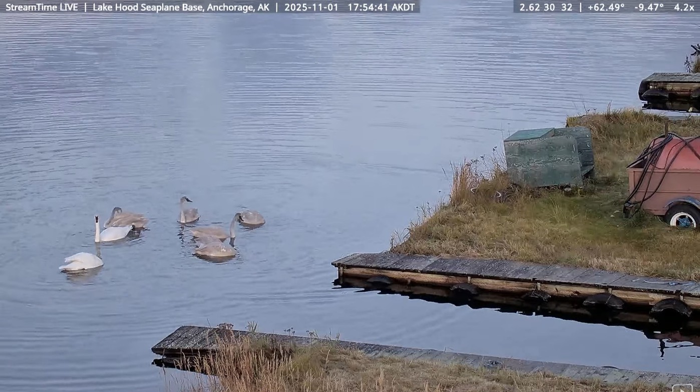 The swans are STILL at Lake Hood. Got a scap of them relaxing and preening this morning and got one a few minutes ago of them grabbing a bite of supper.