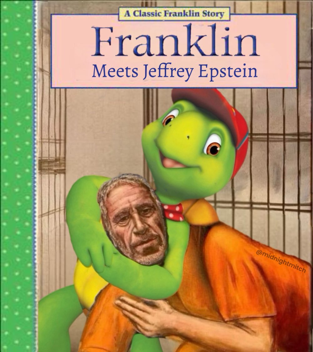 **Well, maybe the Epstein one could have been better. Anatomically speaking, it’s hard to tell what’s going on with Epsteins’s arms and shoulders. I don’t know if “Franklin the Turtle has Jeffrey in a hug or in a Hammerlock; but the message is still communicated.