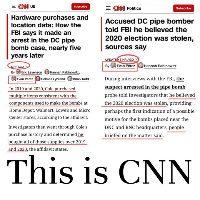 When news broke that the FBI had finally arrested a suspect who placed pipe bombs at RNC and DNC headquarters in January 2021, I offered this prediction: "this will turn out to be unrelated to the J6 riot or law enforcement and intelligence agencies, but will be a rando nutcase anarchist." I could have also predicted that the Protection Racket Media would attempt to make the perp into a right-wing MAGA nutcase who voted for Donald Trump. I didn't have "pretend he's a white guy" on my Bingo card, but you can't win 'em all.