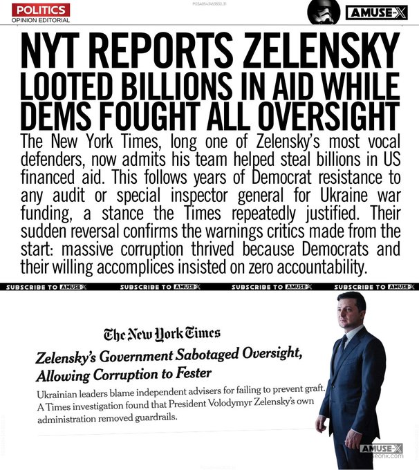 UKRAINE: After years defending Zelensky and opposing audits, the NYT now admits billions in aid were stolen by his inner circle. Democrats blocked oversight. The corruption is finally undeniable. The only question is where is all of the money?