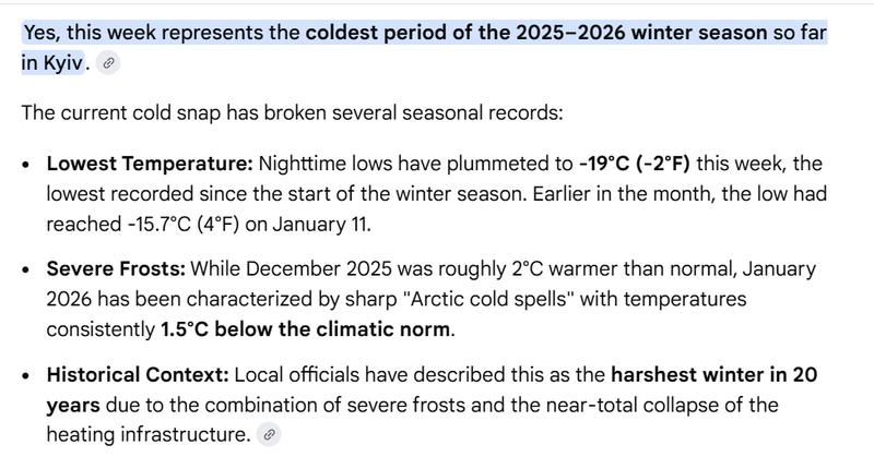 I just read an article that said only 10% of Kiev has power and it’s likely many months before power is restored. Below freezing temps have caused massive water damage to high rise water damage as the water in pipes has frozen and the pipes burst. Kiev minor the only city with that problem.