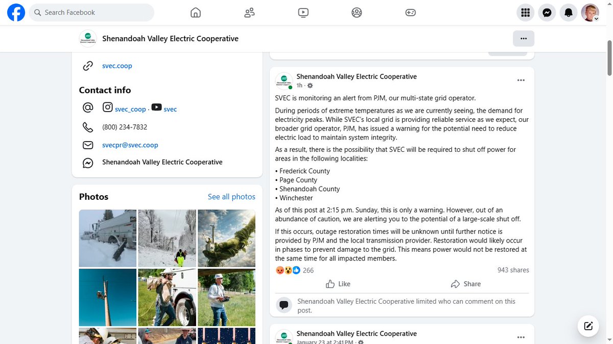 Some local electric cooperatives, like the Shenandoah Valley Electric Cooperative below, who buy power from PJM were still sending notices to area customers about having to potentially shut off power to certain areas in their districts because of power supply shortages.