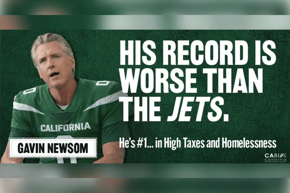 The billboard, paid for by the California Business and Industrial Alliance, criticizes Newsom by comparing him to the sad-sack New York Jets.