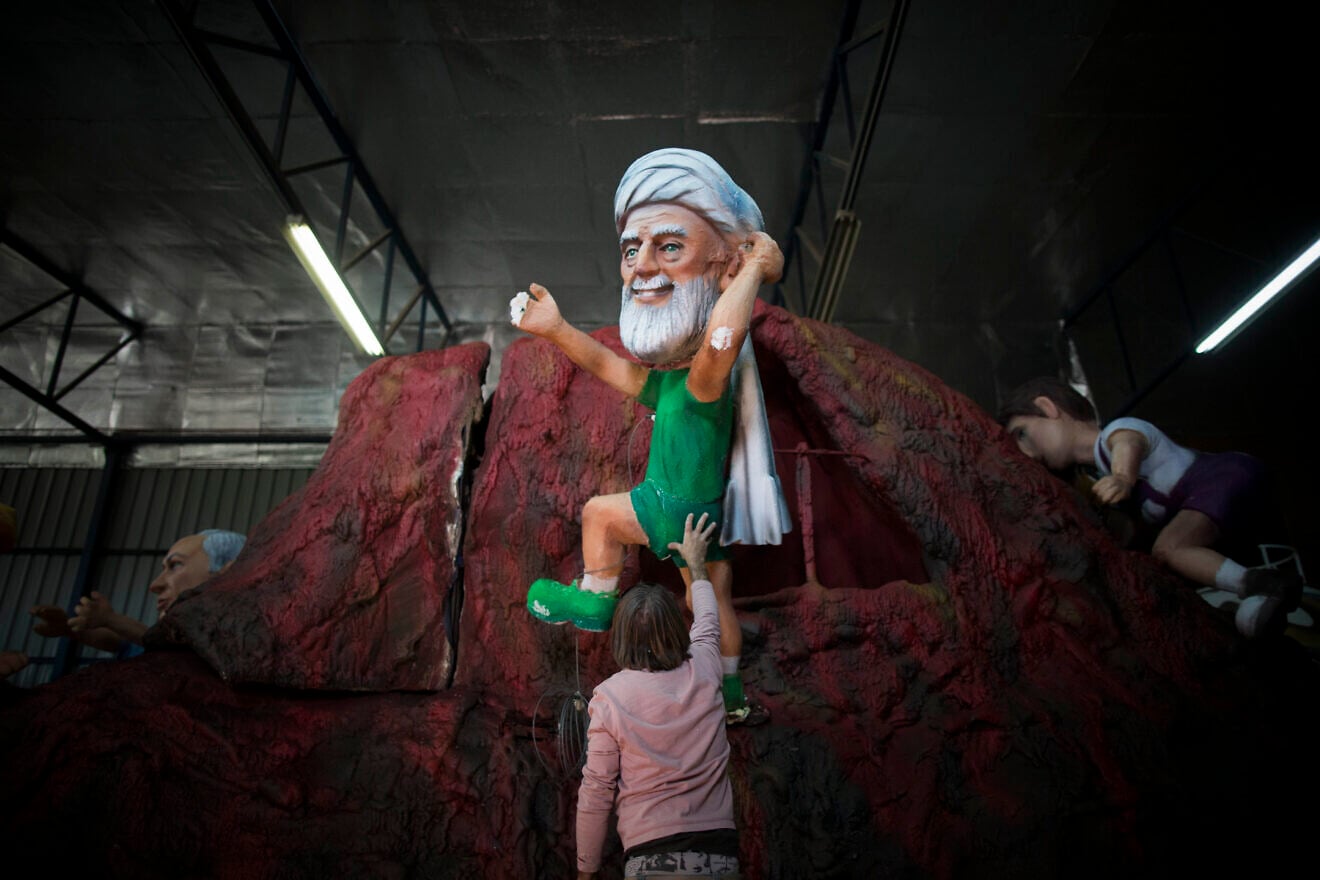 An Israeli worker carries a figure depicting Iran's Supreme Leader Ali Khamenei as part of the preparations for the Israeli annual parade of the holiday of Purim, in a set design factory near Kfar Saba, Israel, Feb. 10, 2014. Credit: Yonatan Sindel/Flash90.