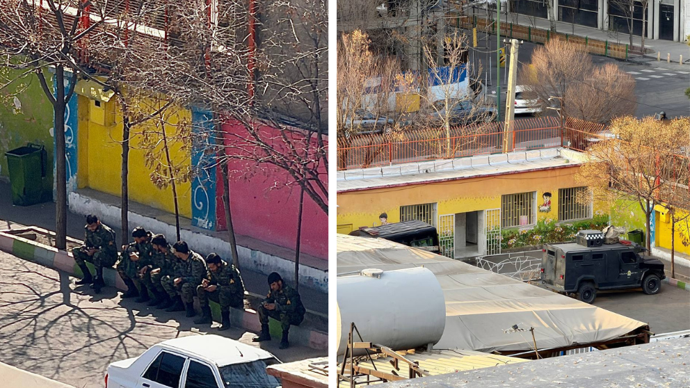 In Khuzestan province in southwestern Iran, eyewitness accounts said military forces were stationed at Takhti stadiums in Izeh and Ahvaz, as well as at Chamran University and near Golestan Hospital in Ahvaz, and at a girls’ primary school in Dezful.