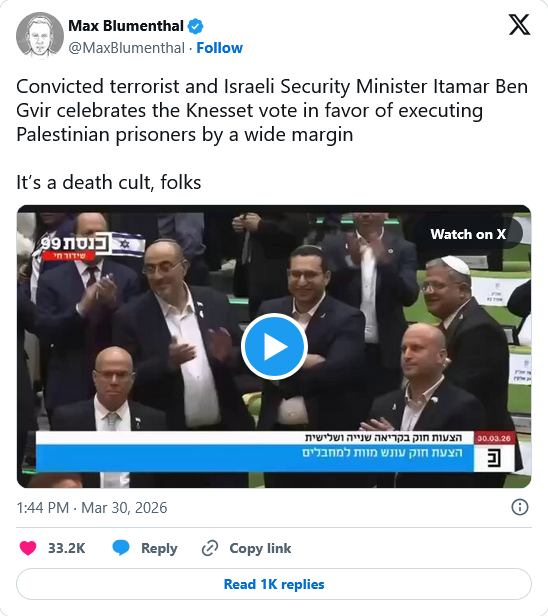 Two years ago, Ben Gvir, who has responsibility for the Israeli prison system, called for executing Palestinians to make more room in the prisons. After Monday’s vote, Ben Gvir proclaimed, “The State of Israel is changing the rules of the game today: whoever murders Jews will not continue to breathe and enjoy conditions in prison. This is a day of justice for the victims and a day of deterrence for our enemies.”