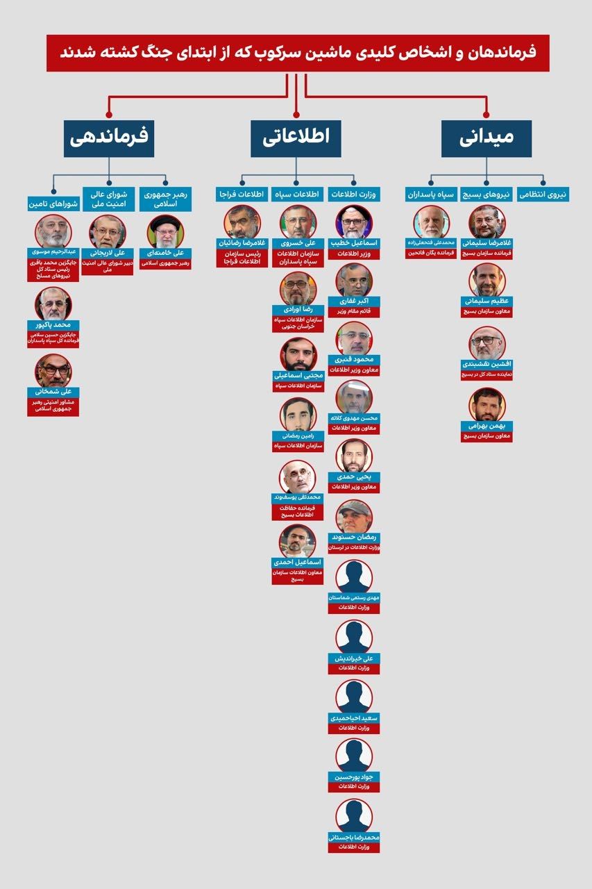 Earlier, in the 12-day war, a group of repression commanders, including Hossein Salami, the former commander of the Revolutionary Guards, Mohammad Kazemi, the head, Hassan Mohaghegh, the deputy, and Mohammad Bagheri, the deputy of operations of the Revolutionary Guards Intelligence Organization, and Mohammad Taghi Yusufvand, the commander of the Basij Intelligence Protection, were killed. became.