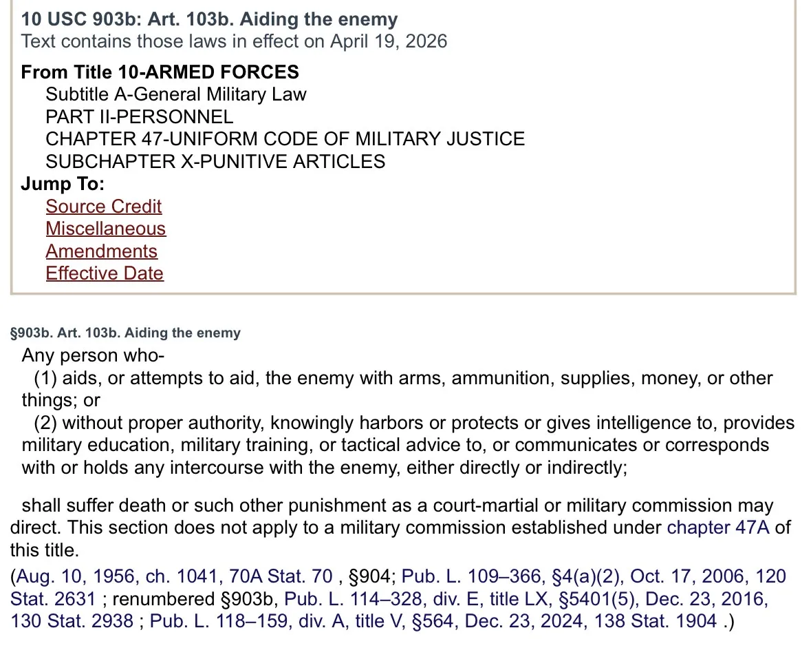If we find evidence that the Obama admin wittingly aided Iran in their pursuit of nuclear weapons, the entire ballgame changes. Providing weapons of mass destruction to a radical Islamic terrorist regime, while we as a nation are still technically in a state of war since 9/11… that’s not just aiding and abetting our enemies, aka treason, it’s a direct threat to NATSEC and an act of war against the United States. (See below, 10 USC Section 903b. Article 103b.)