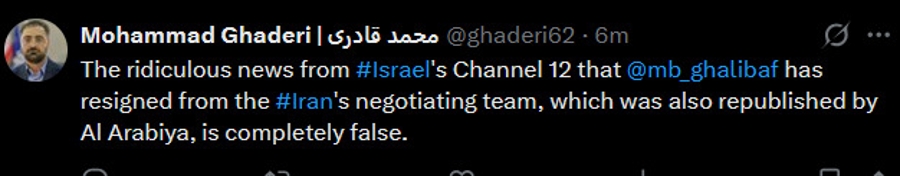 Parliament Speaker Ghalibaf is reportedly resigning from the negotiating team after the Islamic Revolutionary Guard Corps (IRGC) intervened.