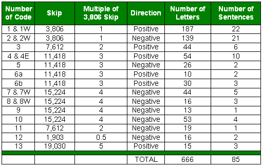 How could there be 666 letters (and 85 sentences) of code within only 372 Hebrew letters? It is much like a DNA molecule. It consists of strands that wrap around one another in a double helix. However, this collection of codes also includes a few triple helixes and a few quadruple helixes as well. The letters in this single column matrix include letters from all but three of the 39 books of the Old Testament, tying together the entire book in a package. Only the very short books of Nahum, Haggai and Jonah are not touched by this single column of encoded letters, which is mind-boggling.