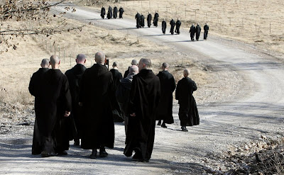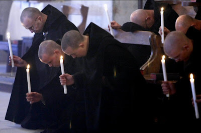 Careful not to make the slightest noise, Carpenter and the other laymen wait patiently while the monks pass. The last one out the door hits a light switch, leaving everybody else in the dark.