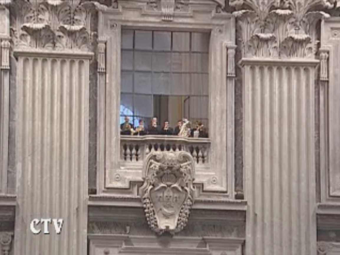 The ceremony is begun with a fanfare from the inner loggia of St. Peter's Basilica: