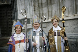 That would be Lutheran bishop of Stockholm Eva Brunne on the left. Eva is in a 'registered and blessed' homosexual partnership. She and her 'partner' have a child conceived through artificial insemination.