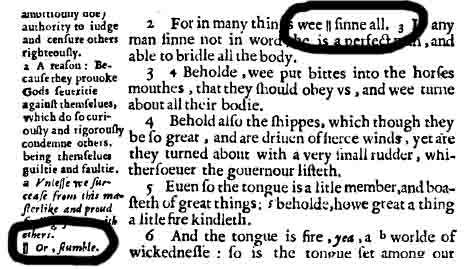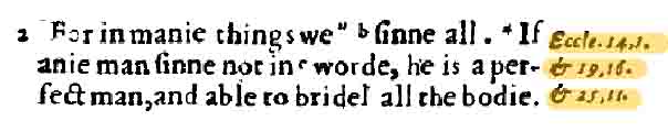 The 1560 edition gives James 3:2 three consecutive cross references to the Book of Sirach (Sir. 14:1, 19:16, and 25:11). There is nothing earthshaking regarding these cross references. Still, its interesting that the editors of the 1560 edition saw multiple contacts with Sirach while the editors of the 1599 entirely omits all three.