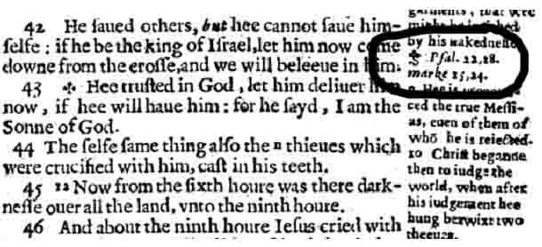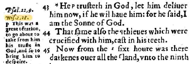 The 1560 edition of the Geneva Bible listed two cross-references for Matthew 27:43, namely Psalm 22:9 and Wisdom 2:18. Unlike Psalm 22:9, only Wisdom 2:18 links God's promise to rescue the Just One's claim to be the Son of God. However, the 1599 edition of the same Bible retains only Psalm 22:9 replacing Wisdom 2:18 with a cross reference to the Gospel of Mark.