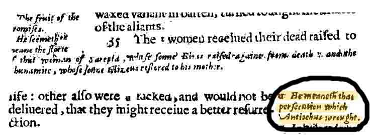 The Geneva 1560 edition oddly omits a cross reference to 2 Maccabees 7:1-42 in Hebrews 11:35 even though the connection between these two texts is beyond doubt. Not only is Second Maccabees 7:1-42 the only place in the Greek Bible where people suffered torture and death explicitly for their hope in the resurrection (2 Macc. 7:9, 11, 14, 23, 29), but Hebrews 11:35-36 describes their suffering using the same words as Second Maccabees (tympanizo and empaigmos). The 1599 edition remedied this earlier defect, not by cross referencing 2 Maccabees 7:1-42, but by inserting the cryptic statement, "He [the writer of Hebrews] means that perfection which Antiochus wrought." In my book, Why Catholic Bibles Are Bigger: The Untold Story of the Lost Books of the Protestant Bible (Grotto Press, 2007), I chronicle the demise of the "Apocrypha" in Protestant Bibles. And frankly it was one of the most difficult sections of my book to write since I could see how so many Protestants today have been unknowingly robbed of their Protestant heritage because later editors were embarrassed by the beliefs of the predecessors. It seemed clear to me then (as it does now) that these omissions were not the result of overcrowded margins. They were removed for another purpose. As the Protestant theologian William Daubney explains, "Plainly, the references to the Apocrypha told an inconvenient tale of the use which the Church intended should be made of it; so... these references disappeared from the margins" (The Use of the Apocrypha In the Christian Church (London: Clay and Sons, 1900), 21). Hence we see the Pilgrims' regress from the historic form of the Protestant Bible. Not only that, but even more importantly, we see an even further departure from the form of the historic and ancient Christian Bibles, which always included the Deuterocanon interdispersed within the Old Testament corpus.