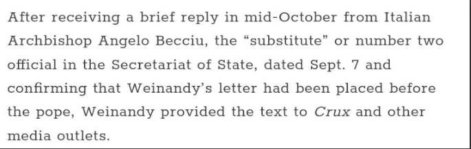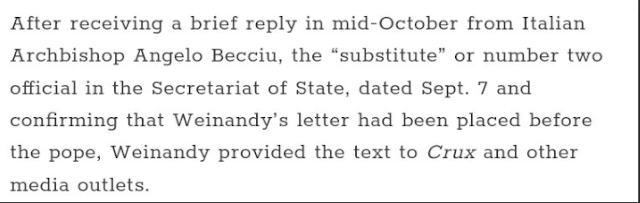I still wondered why he didn't make it public straight away, at the end of July, wondering if he had perhaps waited for a reply from the Holy Father, but that answer is given in Crux: