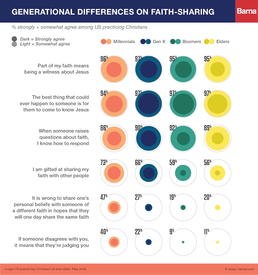 Being on the "wrong" side of the generation gap (older side) is a completely different experience than being on the "right" side (younger side). The older I get, the more curmudgeonly I feel. At times, though, my age, knowledge, and experience underline my differences with younger generations to the point where I must affirm that my side is the right side. Barna's recent report about the state of evangelism among practicing Christians highlights that there are times when the older generations need to hold the line against the folly of younger generations. The report reveals the staggering fact that nearly half of millennials who are practicing Christians believe that evangelism is wrong.