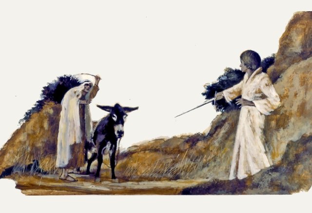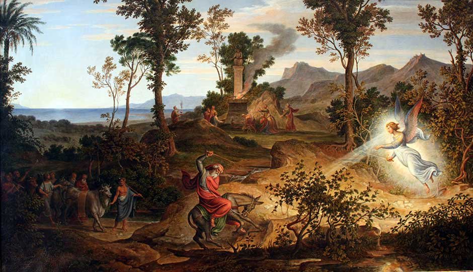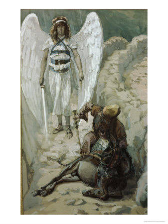26 Then the angel of the Lord moved on ahead and stood in a narrow place where there was no room to turn, either to the right or to the left. 27 When the donkey saw the angel of the Lord, it lay down under Balaam, and he was angry and beat it with his staff. 28 Then the Lord opened the donkeys mouth, and it said to Balaam, What have I done to you to make you beat me these three times?