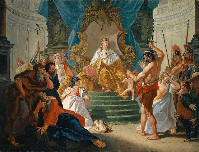 The Poussin is very likable: expressive and dramatic, it tells the story very, very well. No one ever asks which is my favorite, and generally I don't volunteer it; but I'm partial to #6, de Troy's, which is why I placed it first.